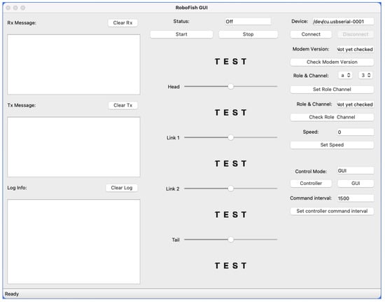 An interactive Python GUI, shown in Figure 14, was developed to run the RoboFish manually from a distance using the acoustic modem. The modem has a configurable data link and is interfaced using a lightweight API, on which the GUI design is based. The default serial protocol is documented in Reference [44]. This document describes the modem’s Data Link Layer protocol. With this protocol, packets are sent to and received from the modem with serial communication commands taking this format 115,200 8-N-1 (payload size is 8 bytes). A Python script was put together to enable sending and receiving of these commands to and from the modems through the serial port. The commands can be sent as a string represented by descriptive variable names or the GUY. By configuring the modem that is installed in RoboFish as a receiver and the topside modem as a transmitter, an operator can send these predefined commands to control RoboFish manually over the acoustic channel if required. Through this GUI, the operator can primarily control the degree of freedom for each joint by sending over acoustically the required angle from the topside computer to RoboFish. In addiition, the GUI enables remote ON/OFF control, steering, selection of communication channel and displays notifications received from RoboFish in humanly readable format for the operator.