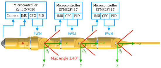 In Figure 15, the RoboFish prototype is shown with its main control components. A monocular camera in the head is used for visual odometry and for detecting and tracking obstacles in the environment, with image processing running on the Zynq Z-7020 SoC in the head module. The inertial measurement units in each module of the body provide dynamic feedback from the body position. These are the main sources of sensory input for the locomotion control system. Currently, in the absence of sensory data (for example, if no visual odometry information is available), the system runs in open-loop mode, and control parameters for forward velocity and angular velocity are read directly from the desired movement commands. The output of the CPG-based controller is transmitted to the servo motors in each joint via PWM signalling. The feature parameters of CPG will change the speed of the robotic fish while swimming. The power consumption of the servo motors will be recorded to compare the energy consumption corresponding to specific sets of CPG feature parameters. The modulation of the CPG will be restricted by each module’s battery life. A comparison of swimming performance resulting from the conventional control methods cited and the CPG design will be done after both control methods are implemented on RoboFish.