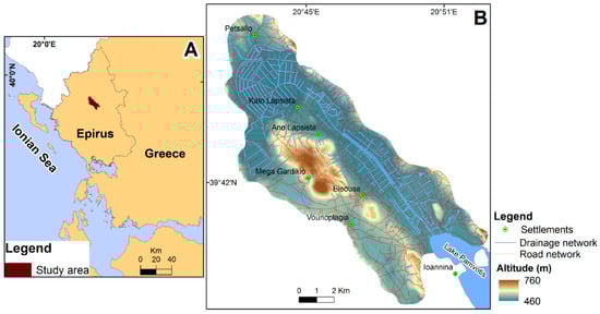 The area studied is located in the administrative region of Epirus in western Greece and is a part of the Ioannina basin (Figure 1A). A part of the Ioannina city is situated within the limits of the study area. The city is the largest city of Epirus and the eighth-largest city in Greece. The study area hosts several human activities such as agriculture and tourism. According to Papadopoulou-Vrynioti et al. [48], the Ioannina basin is a karst landscape that is characterized as polje. This type of surface karst feature is an elongated depression, including a flat floor. Thus, the study area has a smooth relief with gentle slopes. Its morphology comprises a lowland area with an altitude of 460 m a.s.l. and a hilly area reaching an elevation of 760 m a.s.l. (Figure 1B). It covers an area of 101 km2 and is drained by an artificial network.