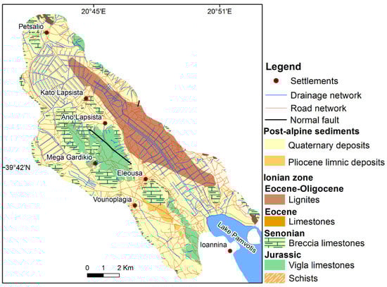 Figure 2 illustrates the geological formation of the study area. It is comprised of the Ionian geotectonic zone and post-alpine sediments formation [50]. The alpine formations consist of Jurassic schists; (b) Upper-Jurassic Vigla limestones; (c) Senonian micro-breccia limestones; (d) Eocene limestones [51,52]; and (e) Eocene to Oligocene lignites [53]. The post-alpine sediments include Pliocene limnic sediments and Quaternary deposits [54]. The Quaternary deposits cover a significant part of the area studied (Figure 2). Their composition includes fragments of flint, terra-rossa and Fe-Mn oxides [48,55]. The following soil types are observed in the land uses of the study area [56]: (a) Calcari-lithic Leptosol (Ic), which are found in areas where the soil has been eroded to the extent that hard rock comes near to the surface; (b) Chromic Luvisol (Lc), which generally occur on well-drained landscapes and are fertile soils suitable for a wide range of cultivated crop plants; and (c) Calcaric Fluvisol (Jc), which are found in periodically flooded areas.