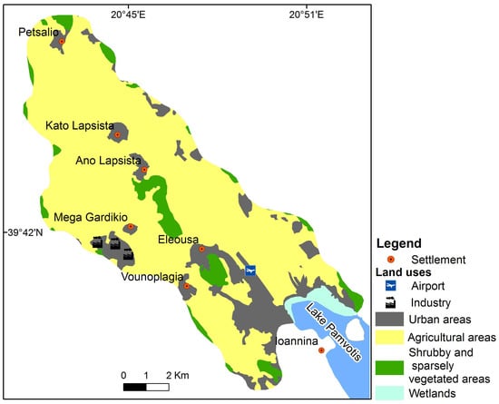 Under the CORINE 2012 Land Cover (CLC) Copernicus classification system [48], land use within the Ioannina plain is reported as the urban fabric of residential areas along with main roads and a mixture of agricultural, light industry, wetlands, shrub and sparsely vegetation areas (Figure 3). The establishments of the Ioannina city’s airport are located in the southern part of the area studied. The main industrial area is situated on the Ioannina plain’s western edge and includes vehicle crushing and car dismantling activities (Figure 3).