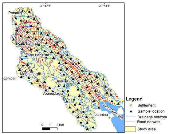 The data collected for this study include (a) a topographic map at a scale of 1:50,000, published by the Hellenic Army Geographical Service (H.A.G.S.); (b) a geological map at a scale of 1:50,000 (sheet Ioannina), published by the Institute of Geology and Mineral Exploration-IGME [50]; (c) information derived from the European Soil Atlas [56]; (d) the CORINE/Land cover from the Copernicus program [57]; and (e) a soil geochemical database derived by Vryniotis [55].