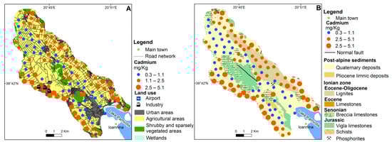 Graduated symbol plots of Cd content in soil of Ioannina plain concerning land uses (A) and geology (B).
