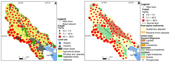 Graduated symbol plots of Co content in soil of Ioannina plain concerning land uses (A) and geology (B).