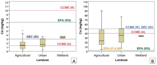 Boxplots for (A) Cd and (B) Co, comparing element concentration to guideline established by the literature (EPA, CCME and DEC). EPA (RS): Residential soil regional screening level, EPA (P,A,M): plant-avian-mammalian screening level, EPA (A,M): avian-mammalian screening level, CCME (A): soil quality guideline for agricultural land use, CCME (R): soil quality guideline for residential land use; DEC (EI): ecological investigation level.
