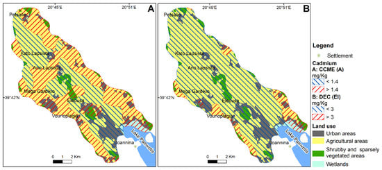 All the sampling sites in Ioannina plain present Cd content in soil lower than the CCME (R) and the residential soil screening level (RS) established by the EPA (Figure 7A), suggesting that there is no potential risk for residents. In contrast, all the sampling sites present Cd concentration in soil higher than the EPA’s plant-avian-mammalian screening level (Figure 5B). In a research study conducted in Kontodespoti-Makrimalli area (Evia island, Greece) following the August 2019 wildfire, it was revealed that Cd content in burned topsoil and ash exceeds the EPA (P,A,M) screening level [35]. In the 54.2% (8.0 km2), 52.7% (41.0 km2), 60% (3.9 km2) and 83.8% (1.3 km2) of the urban, agricultural, shrubby-vegetated and wetlands land use, the Cd content in soil of the study area is well above the soil guideline values for agricultural land use established by the CCME (A) (Figure 7A and Figure 8A). All the sampling sites at the area studied present Cd content in soil lower than the EPA (RS) and CCME (R) (Figure 6A).