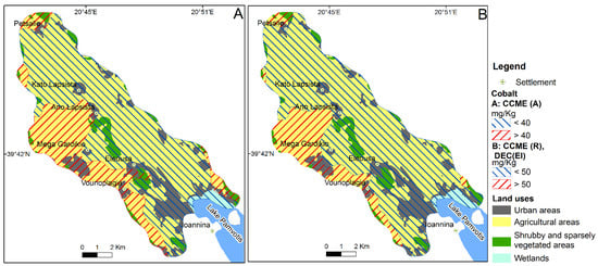 All the sampling sites present Co content in soil higher than EPA (RS) and EPA (P,A,M), suggesting a potential risk to residents and ecological receptors (Figure 7B). In an investigation of land suitability of a Mediterranean site located in Evia island (Greece), Alexakis [35] reported that Co content in topsoil was the limiting factor for residential land use. Moreover, an investigation of land suitability after the July 2018 western Attica wildfire (Kineta area, Greece) revealed that Co concentration in ash was also among the limiting factors for residential land use [34]. Cobalt concentration in soil of the study area exceeding the CCME (A) is observed in the 24.3% (3.6 km2), 28.3% (22.0 km2), 33.1% (2.2 km2) and 1.7% (0.03 km2) of the urban, agricultural, shrubby-vegetated and wetlands area, respectively (Figure 9A).