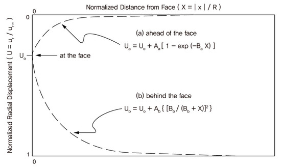 The proposed LDP calculation formula is a function of the excavation distance and does not consider the parameters for the ground conditions. Unlu and Gecek [12] proposed normalized radial displacements using numerical analyses and statistical regression to account for the effect of Poisson’s ratio on circular tunnels under elastic ground conditions. Unlu and Gercek [12] believed that it was difficult to obtain a good correlation for expressing the normalized LDP in the form of a single sigmoid curve when curve fitting the results of tunnel air displacement obtained via numerical analyses. Moreover, they proposed a formula for determining the LDP by dividing it into two parts, as shown in Figure 4, based on the tunnel face.