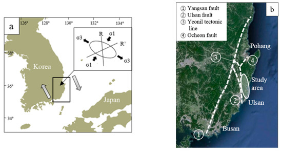 The rock mass properties obtained from the Korean railway construction site (Figure 6) were used as input values for the numerical analysis. The Songjeong Tunnel, which features an extension of 10 km, is located at this construction site. The Ulsan and Ocheon faults are in the area where the Songjeong railway tunnel is planned; these are large faults that extend for approximately 50 km and intersect with the Yeonil tectonic line, which has a 50-m-wide brittle layer. The distribution of rock quality on the project site is generally poor; mudstone and andesite are noted at the starting point, whereas most of the remaining section features granite distributed along the tunnel alignment.