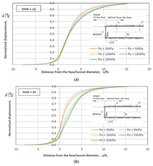 It should be noted that according to the LDP analysis results obtained in this study, the ratio of the preceding displacement varies from 0.1 to 0.35 according to the change in rock conditions. The LDP of Hoek [8], which showed the best fit for the measured values of tunnel internal displacement reported by Chern et al. [9], simply expresses the ratio of the preceding displacement as approximately 0.3 (Figure 3). This can lead to an error when predicting the ratio of the preceding displacement while neglecting the rock conditions; consequently, a complete tunnel behavior analysis cannot be realized. When the initial stress increased, the LDP tended to move toward the right, and this tendency became more dominant under the condition of poor rock quality (Figure 8). This is attributed to the effect of increasing the plastic area around the excavation surface of the tunnel as the initial stress increases. It means that under high-stress conditions, the rock mass around the tunnel deforms more as compared with low-stress conditions. Furthermore, poor-quality rocks have low load-carrying capacity as compared to strong rocks. Therefore, poor-quality rocks deform more under high-stress conditions.