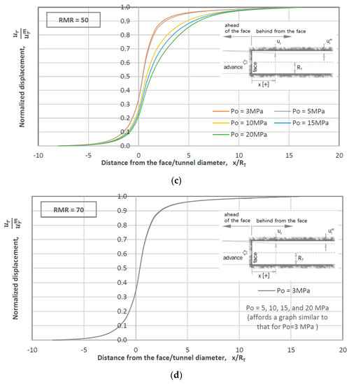 Figure 8 shows the LDP under different initial stress conditions for the same rock mass quality. For RMR = 10, 30, and 50, the LDP changes as the initial stress increases (Figure 8a–c); however, for RMR = 70, there is no change in the LDP with respect to the changes in the initial stress (Figure 8d). Even under the condition of RMR = 90, the same trend as that under RMR = 70 was observed, and therefore, the results are not included in the paper. This is likely due to the effect of the increase in the plastic zone when the initial stress increases under poor rock quality. In fractured rock conditions where joints are developed, the LDP should be considered important because it is affected by both the rock quality and the initial stress conditions.