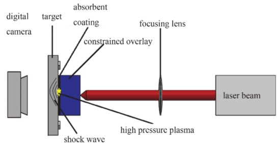 Laser shock uses high power density (109 W/cm2 magnitude) and short pulse width (10~30 ns magnitude) to irradiate the surface of the material through the transparent constrained overlay, so as to produce mechanical effects on the surface of the material. If the material has significant plastic deformation, it is called laser shock forming. In contrast, if there is no significant plastic deformation found on the surface of the target, and only the surface structure and mechanical properties of the target material are changed, it is called laser shock processing. According to the principle of laser shock processing [11], the authors of this research designed the experimental scheme shown in Figure 1.