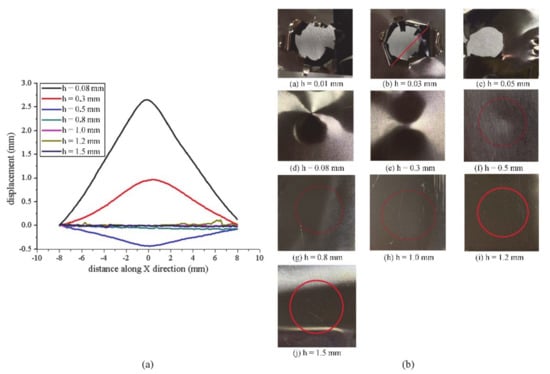 The spot diameter was selected to be 7 mm, and a 10 J single pulse laser was used to impact TC4 titanium alloy targets of different thicknesses. The target thicknesses were 0.01 mm, 0.03 mm, 0.05 mm, 0.08 mm, 0.3 mm, 0.5 mm, 0.8 mm, 1.0 mm, 1.2 mm and 1.5 mm respectively. The thickness of TC4 titanium alloy targets ranging from 0.01 mm to 0.5 mm had obvious plastic deformation, whereas the targets larger than 0.5 mm had no visible deformation. Figure 2a shows the back outline of targets with different thicknesses under the impact of 10 J laser pulses. Figure 2b exhibits the morphologies of the target material after a single impact deformation.