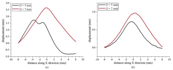 When h = 0.08 mm, the maximum deformation of the target under 5 mm spot diameter was 1.7406 mm, and the maximum deformation of the target under 7 mm spot diameter was 2.6519 mm. When h = 0.3 mm, the maximum deformation of the target material was 0.7282 mm under the 5 mm spot diameter and 0.9675 mm under the 7 mm spot diameter. The results show that when other experimental conditions stay constant, the laser spot diameter affects the load applied by the laser pulse on the target surface, which in turn affects the plastic deformation of the target material, and the deformation of the target grows with the increase of the spot diameter. The area where the laser acts on the surface of the target will increase with the rise of spot diameter, and that means the spalling area of the target material will become larger. The cracks and holes formed and grown under laser loading, when combined, will merge to form one or more consecutive fracture surface which penetrates the material, resulting in failure damage. At this time, the increase of the spot diameter will accelerate the failure damage behavior of the material. It is necessary to choose the appropriate laser process according to material characteristics. From the above results, a larger laser spot diameter can be selected for TC4 titanium alloy with high yield strength, whereas a smaller laser spot diameter selected for materials with low yield strength [19,20].