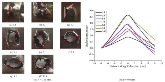 When h = 0.08 mm, it was found that the surface of the target material rebounded. For the titanium alloy target material with a thickness of 0.08 mm, the laser energy of 10 J is slightly low, although the target material can be deformed under this energy. However, due to the large range of the laser-induced impact force and the short deformation time, the target material rebounds at the center of the impact, and the deformed back of the target material presents a “concaving in the middle and protruding at both ends” shape. When the thickness of the target material increases, because the laser energy is low, the range of impact force is small, and the forming depth is shallow, so there will be no rebound. The following chapter will elaborate on this phenomenon.