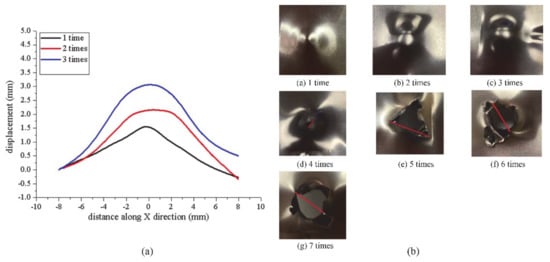 The laser shock experiments on TC4 titanium alloy target with thickness of 0.08 mm were carried out under the following conditions: the laser energy was 6J, the spot diameter was 7 mm, and the impact time ranged from 1–7. The outline and morphologies of targets with different impact times are shown in Figure 5. Table 4 shows the changes in the target spalling deformation degree from 1 shock time to 7 shock times.