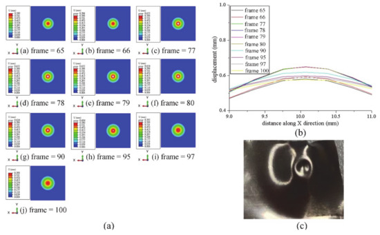 It can be seen from Figure 3, when the thickness of the target was 0.08 mm, the spot diameter was 5 mm, the laser pulse energy was 10 J, and the pulse width was 10 ns, the back of the target appeared to exhibit the rebound phenomenon. The simulation results and experimental results under this impact condition are shown in Figure 6. At the end of the simulation process, the maximum shape variable of the target with this thickness was 0.582 mm, and the maximum limit of deformation was set to 0.590 mm in the software. As shown in Figure 6a, with the increase of the number of frames, the target deformation gradually increased from the maximum value of 0.590 mm to the maximum value of 0.655 mm. At this point, frames 77, 78 and 79 were all in the same state, and the displacement of the impact center of the target material was more than 0.590 mm and less than 0.655 mm. Figure 6b quantitatively verified the correctness of the above conclusion. As shown in the Figure 6b, when the number of frames was gradually increased from 66 to 100, the maximum displacements were 0.581 mm, 0.591 mm, 0.650 mm, 0.650 mm, 0.649 mm, 0.648 mm, 0.618 mm, 0.598 mm, 0.589 mm and 0.577 mm, respectively. After the shape variable reached the maximum value, it gradually decreased, forming a rebound. The laser-induced shock wave acts on the surface of the target material, which will be deformed under the influence of the shock wave pressure, and the deformation of the target material gradually increases over time. After the laser action, the shock wave pressure will gradually attenuate, and the target will continue to deform under the attenuated shock wave until the deformation reaches its maximum value, at which time the shock wave reaches the back of the target. When the laser energy and the thickness of the target material reach the corresponding conditions, under the action of the reverse stretching wave, the target material will go through a reverse deformation effect and the target material will rebound. Figure 6c is the surface topography of the target material after the experiment, and it can be clearly seen that the target material appears to rebound in the convex area.