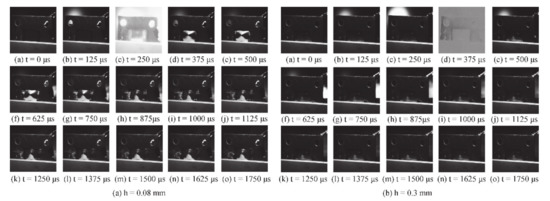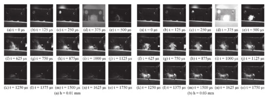 As can be seen from Figure 8b, the graphs showed the changes in the morphology of the target at different times when the target thickness was 0.3 mm. The experimental results before 375 μs were similar to the above experiments. At 375 μs, it was found that the brightness of the white light generated by the plasma blast wave was too strong and the back surface of the target material under this experimental condition was not as obvious as the previous experimental results. Hence it was difficult to see the specific morphologies of the target material back at this moment. In the next step, it could be observed that there was a slight plastic deformation on the back of the target material, and no obvious change in the amount of deformation on the target back was observed with the naked eye after this moment. Due to the high cracking strength of TC4 titanium alloy material, the water flow acted as a constrained overlay and was not found to affect the deformation of the target.