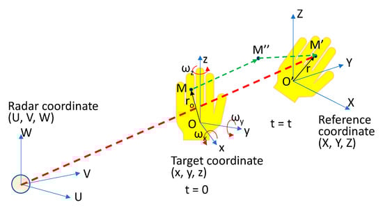 Suppose the hand has a translation velocity v with respect to the radar and an angular rotation velocity ω represented in the reference coordinate as ω = (ωX, ωY, ωZ)T. A point scatterer M on the hand, located at r0 = (X0, Y0, Z0)T, at time t = 0 will move to M′ at time t. This movement can be considered as a translation from M to M″ with velocity v and a rotation from M″ to M′ with an angular velocity ω. At time t, the range vector from the radar to the scatterer at M′ becomes