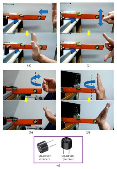 Hand gestures: (a) Push motion. (b) Wrist from flexion to extension. (c) Pinch out motion. (d) Hand rotation motion. (e) Used ultrasonic emitter and receiver.