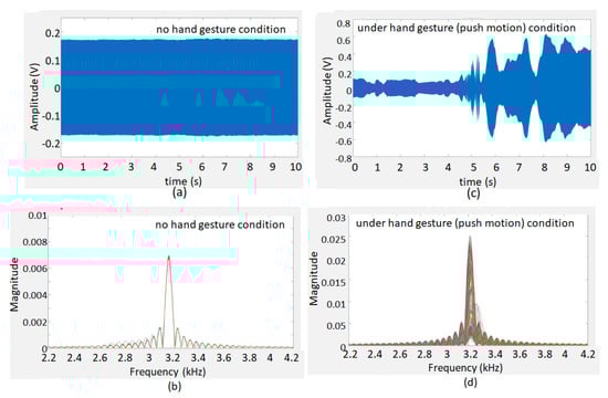 Figure 5 shows the processed results of the time-domain signals and their frequency spectrum without any hand gesture and with a hand gesture (push motion) occurring approximately at 5 s. The spectrum results were overlaid by fast Fourier transform analysis through a continuous short-period analysis.