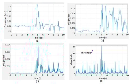 Two parameters were investigated to determine the start time of the hand gesture operation for each short-time signal processed with the aforementioned bandwidth and notch filters: the frequency shifts and the amplitudes of the frequency peaks.