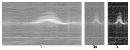 However, the contrast of the image was not sufficient to differentiate the motion part from the background. An image processing technique for histogram equalization was employed to enhance the contrast. Based on the histogram analysis of the image derived from the STFT, all the pixels were at a higher gray level, which indicates that the image had an over-exposure trait. We utilized the following equations so that the pixel values could be mapped in the range from 0 to 255: