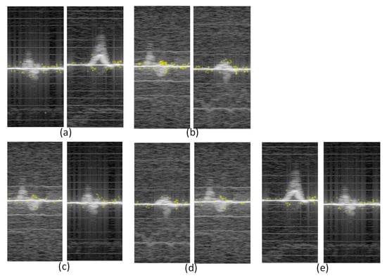 Subsequently, different gestures were examined. For every two cases of the same gestures discussed above, we tested the other three cases of gestures. We selected some examples to illustrate the matching results. Figure 10a–e shows the results of using the rotation motion “A” to test the push motion “A”, the wrist motion from flexion to extension “A” to test the pinch out motion “A”, the wrist motion from flexion to extension to test the rotation motion “A”, the pinch out motion “A” to test the wrist motion from flexion to extension “A”, and the push motion “A” to test the rotation motion “A”, respectively. The corresponding numbers of matching points were 30, 37, 25, 26, and 26, respectively. The marked matching points (yellow circle) in Figure 10 indicate much smaller numbers compared with that of the same gestures. Therefore, a borderline of the matching points could be set to distinguish similar gestures and different gestures using our proposed method.