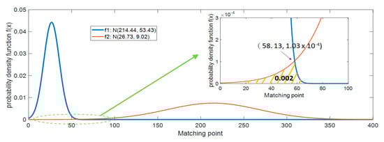 Let X1 be the matching points for the cases of failure of hand gesture recognition possessing the normal distribution N(μ1, ) with probability density function (pdf) F1(x) and cumulative density function (cdf) F1(x) and X2 be the matching points for the cases of correct hand gesture recognition possessing the normal distribution N(μ2, ) with pdf F2(x) and cdf F2(x), μ1 < μ2. The area of intersection zone, which indicates the probability of faulty hand gesture recognition, could be found by