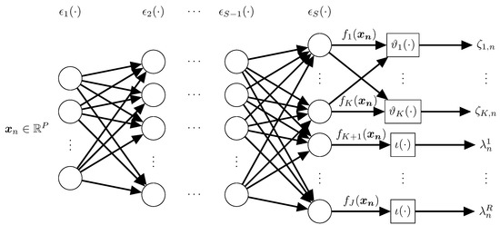 where is a parameter vector, and . Here, each maps an input sample to the parameter space, being the domain for the j-th parameter (). A chained deep neural network (CDNN) can be introduced linking each likelihood parameter to one of the J outputs of a deep neural network comprising S hidden layers. Accordingly, let be a vector containing the J outputs of a deep network: