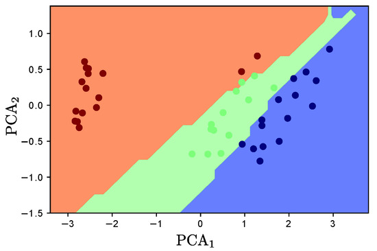 RCDNN’s decision boundaries for the 2D-PCA Iris dataset (synthetic scenario). AUC . The point’s color stands for the Iris dataset classes. and stand for the first and second PCA-based projections.