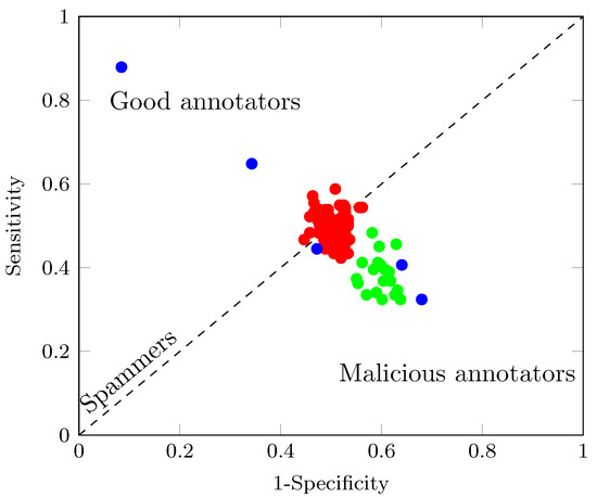 Receiver operating characteristic (ROC) plot for the annotators simulated within the spammers and malicious scenario. Blue dots indicate the basis annotators. Red dots show extra annotators with parameters , and . Green dots specify extra labelers with , and . We notice that annotators located in dashed line vicinity are considered Spammers. Similarly, labelers above the dashed line are regarded as good annotators; conversely, labelers located below such a line are malicious annotators.