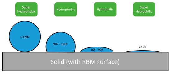 Arbitrary degrees of wettability have been established, depending on the angle of contact, and the parameter is classified into four categories: superhydrophobic, hydrophobic, hydrophilic, and superhydrophilic (Figure 2).