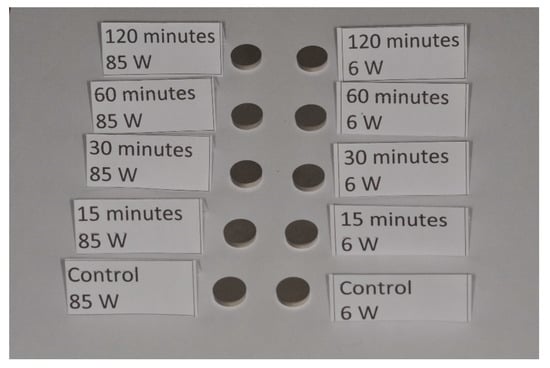 In each group, one disc was used as a control, which received no irradiation and was processed according to the same methodology (Figure 3).