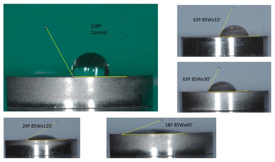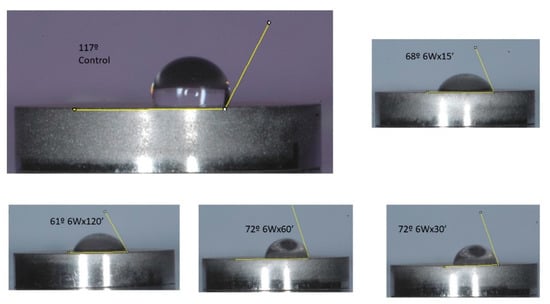 These differences were accentuated by an increase in time. However, the results revealed that the most significant effect depended on the power of the emitter, although the effect was not evident before 30 min. After 60 min, the effect of 85 W was significantly more pronounced (73° versus 19°) and was equally or more effective at 120 min (61° versus 31°). However, in the case of the 85 W group, this improvement did not change to any great extent, changing from a contact angle of 19° at 60 min to 31° at 120°, a paradoxical effect not seen at 6 W. We share the opinion that this is due to the saturation of compounds in the atmosphere, which, once detached from the titanium surface, are re-deposited on the titanium surface with its increased absorption capacity.