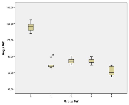 Box plot of angles obtained with a 6 W lamp at different irradiation times, including the control. The graphs show the lower (Q1), mean (Q2), and upper (Q3) quartiles.