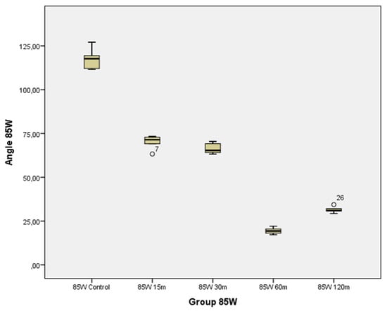 Box plot of angles obtained with an 85 W lamp at different irradiation times, including the control. The graphs show the lower (Q1), mean (Q2), and upper (Q3) quartiles.