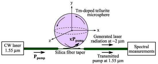 The general scheme of the analyzed system is shown in Figure 1. It consists of a thulium-doped tellurite glass microsphere and a silica fiber taper for both, coupling the CW pump wave and extracting the generated laser wave.