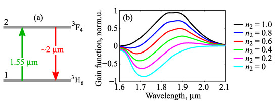 We consider in-band CW pump (3H6 → 3F4) at a wavelength of 1.55 μm and lasing in the 2 μm range (3F4 → 3H6) as shown in Figure 2a. The cross-relaxation process, which can play an important role for a pump at ~0.79 μm [32], is neglected here, because levels above 3F4 are almost unpopulated under in-band pump. Here, we used the two-level approximation, which is equivalent to the quasi three-level model because the transition from the pump level to the upper laser level (both belong to the 3F4 manifold) is very rapid at a room temperature, so the population of the pump level is almost zero (please see Appendix A for details). Let us define the population densities of the 3H6 and 3F4 levels as n1 and n2. They are normalized to the concentration of Tm3+ ions NTm and satisfy the expression