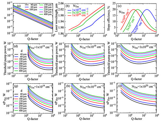 We consider critical coupling when an intrinsic Q-factor is equal to a coupling Q-factor: Q0 = Qext (in other words when Teff = T0/2 = Text/2). We set σabs(λp) = 0.05·10−20 cm2 and the emission/absorption cross sections at laser wavelengths as in the paper [34]. We varied Tm3+ ion concentrations, microsphere diameters, Q-factors, and pump powers. The calculated coefficients κ as functions of the total Q-factor for different diameters of a tellurite microsphere ranging from 40 μm to 400 μm are plotted in Figure 3a as well as expected laser wavelengths (Figure 3b), slope efficiencies (Figure 3c), threshold pump powers (Figure 3d–f), and threshold values of coupling coefficients multiplied by pump powers (Figure 3g–i) as functions of the varied parameters of the system. Figure 3d demonstrates that for a Tm3+ ion concentration of 1·1019 cm−3, lasing is possible only if the Q-factor exceeds 106. For lower Q-factors, losses are too large and the gain cannot compensate them; the laser threshold is not reached. With an increase in active ion concentrations to NTm = 5·1019 cm−3 and NTm = 1 1020cm−3, the gain according to Equation (8) grows, and the minimum Q-factors required for generation become equal to 3·105 and 2·105, respectively (Figure 3e,f). Figure 3d–f also demonstrate that for a certain active ion concentration, the larger the microsphere diameter, the higher the threshold pump power is.