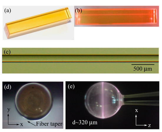 (a) A photography of the polished thulium-doped tellurite glass parallelepiped with dimensions of 8 × 8 × 44 mm. (b) A photography of He-Ne laser beam in this sample. (c) A microphotography of single-index fiber produced from the synthesized glass. (d,e) The images of the experimentally produced tellurite glass microsphere in perpendicular planes from two CCD cameras. The coordinate axes in (d,e) correspond to the axes in Figure 1.