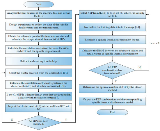 - In the candidate KTP set TK, select KTPs from tk1 to tkr, where r is initially set to 1. Next, establish the prediction model of the thermal displacement of the spindle, the details of which are specified in Section 2.4 and Section 2.5.