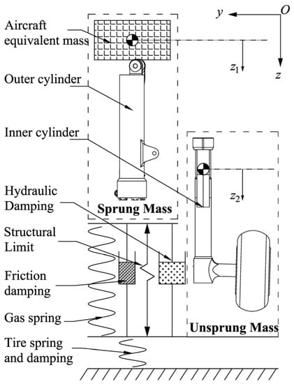 In this subsection, the aircraft half-axle main landing gear (MLG) is selected as the research object, and a two-degrees-of-freedom spring damping model is established, as shown in Figure 1. The aircraft landing buffer response is simplified as the dynamic response of two masses under spring damping constraint in this model [7]. The two masses are the sprung mass and unsprung mass. The sprung mass is the airframe structure and the structural mass above the outer cylinder of the shock absorber, and the unsprung mass is the other structure of the landing gear below the shock absorber piston rod. The oleo-pneumatic shock absorber consists of upper and lower chambers separated by orifices and the metering pin. The upper part of the upper chamber is filled with pressurized nitrogen to provide a gas spring, and the other spaces of the two chambers are filled with oil to provide oil damping. The tire force acting point of the half-axle landing gear is not on the strut axis, which will augment the normal force in the bearing area. In this way, the half-axle landing gear can fully reflect the impact of the friction load on the landing buffer.