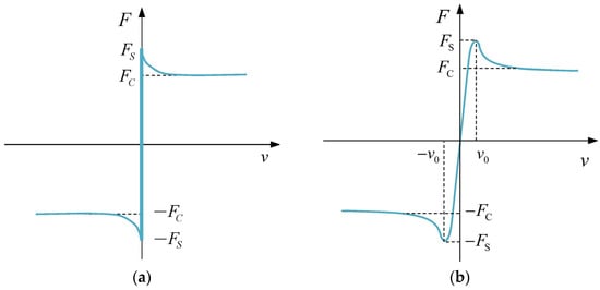 Figure 2a shows the classic shape of the Stribeck curve, which contains discontinuity at zero velocity. This discontinuity brings about several numerical issues during a dynamic simulation. To eliminate the numerical issues at zero velocity, a finite slope model is established to replace the discontinuity at zero velocity, as shown in Figure 2b. The model utilized in this work can be expressed by the following equations: