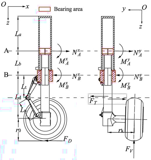 The effects of ground forces on the absorber strut contain the normal force on the bearing area between the outer cylinder and the piston rod, and the strut elastic deformation. Additional bending moments will be generated at the bearing area to ensure that the deformation of the outer cylinder and the piston rod remains consistent within the supporting area. It is embodied by the reaction force on the upper and lower surfaces of the bearing, which increases the total normal force on the bearing area. Figure 3 is a schematic diagram of the internal force analysis for the half-axle main landing gear in the xoz plane and the yoz plane under the ground vertical force and longitudinal force.