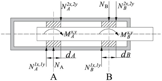 where and indicate the upper bearing width and the lower bearing width, the superscript “1” and “2” mean the upper surface and lower surface of each bearing, respectively. The resultant forces of reaction forces on each surface of the bearing can be presented as