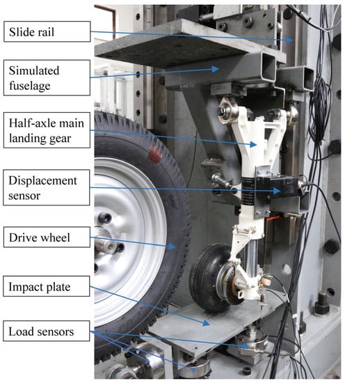 To verify the accuracy of the numerical model of the landing gear, a single landing gear drop test system is established in this subsection, as shown in Figure 6. The truss structure installed on the vertical slide rail is used to simulate the landing gear fuselage installation point and the mass of the aircraft body. The vertical landing velocity of the aircraft is simulated through a fixed height free fall. Turn the wheel of landing gear in reverse to simulate the aircraft landing longitudinal speed. A suitable rough plate is installed on the impact plate to simulate the dry runway. The load sensors are installed at the bottom of the impact flat to measure the ground vertical load and longitudinal load.