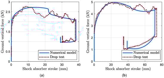 The calculation results of the numerical model of landing gear dynamic responses in two landing conditions were obtained using the same values of landing gear parameters as the drop test, and the parameter values used in this work are shown in Table 2.