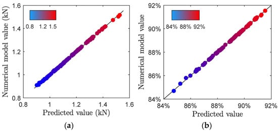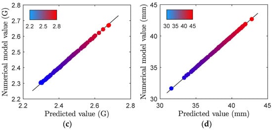 The ANOVA results acquired from the RS-model for the four dynamic responses are shown in Table 8. The table illustrates that all four indexes for checking the coincidence of the fitted model are meet the criteria. Furthermore, the scatter plots of the numerical model response values versus the predicted values are shown in Figure 9. These figures demonstrate that the sample points are split evenly by the 45-degree diagonal.