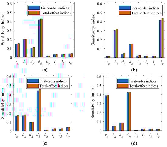 The sensitivity indices for the four landing responses: (a) Max load of strut friction; (b) Shock-strut efficiency; (c) Max overloading of the sprung mass; (d) Shock absorber stroke.